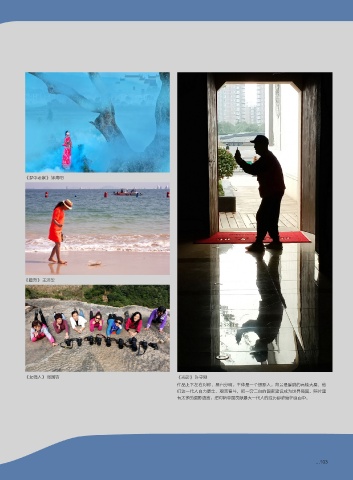 《梦中老家》 钟海明 《踏海》 王济华 《女强人》 张国钧 《光影》 许守刚 作品上下左右对称,黑白分明。主体是一个摄影人。背景是朦胧的高楼大厦,他 们这一代人自力更生、艰苦奋斗,把一穷二白的国家建设成为世界强国。照片里 有太多的摄影语言,把对新中国贡献最大一代人的经历都浓缩在画面中。 ...103