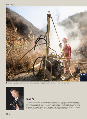 2019年4月5日,陕西省大宁县。东方公司2154物探队司钻在半山腰打井。被钻机吹上来的粉尘弥漫在空中,司钻浑身上下也都是粉尘。