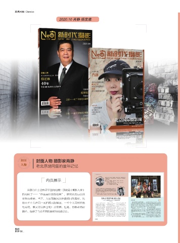 精典回顾 Classics 2020.10 肖静 杨发维 封面 封面人物 摄影家肖静 人物 老北京胡同里的童年记忆 封面人物 / COVER PEOPLE 内页展示 肖静为什么会执着于重构拍摄?那就是《摄影人学》 的范畴了——“作品是状态的结果”,研究状态远比欣 赏作品重要。当下,大家都跟风去拍摄相同的题材,比 如六千个人在同一天拍摄元阳梯田,一千个人同时拍鱼 吃荷花,谁又可以胜出呢?非常难。但是,肖静却另辟 蹊径,选择了与众不同的题材和拍摄手法。 6 |新时代摄影 7 88...
