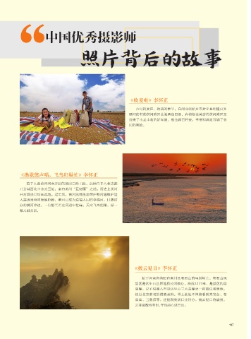 新时代摄影家 / NEW ERA “ 中国优秀摄影师 照片背后的故事 摄影师:李怀正 《收麦啦》李怀正 《渔歌悠声唱,飞鸟归巢忙》李怀正 摄影师:金建忠 《拨云见日》李怀正 摄影师:刘晓文 116 丨新时代摄影 117