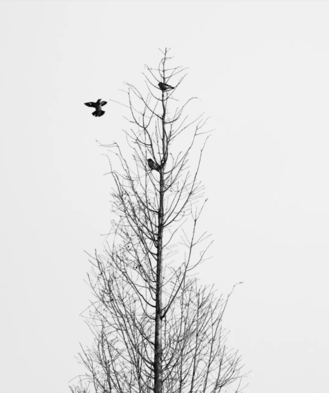 (飞的一瞬间)这是一张黑白照片,树上有三只鸟儿,一只鸟离开树,还有两只鸟儿看着正在飞翔的鸟儿,觉得很有故事性。
