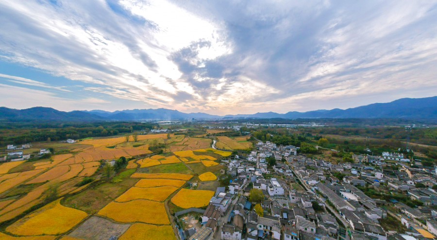 辞道“芳与泽其杂糅兮,羌芳华自中出”,半片是人家,聚集人间真情,半片是田野,收获春华秋实,借远处青山,想锁住这平和一方。